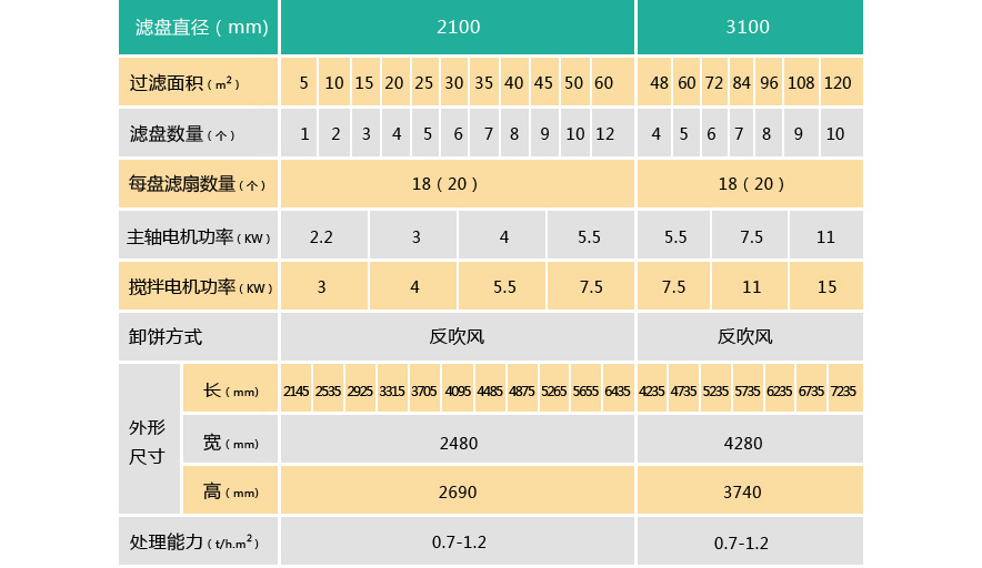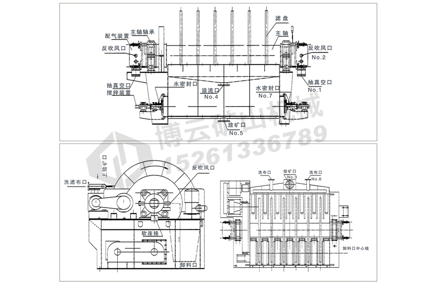 連云港博云礦山機械生產(chǎn)的PG系列盤式真空過濾機 (1)扇形濾板脫水孔分布均勻,孔率合理,筋條尺寸大,由高強度工程塑料制成,壽命提高了2-3倍。 (2)濾液管過濾數(shù)面大,分配頭腹腔容積大,提高了抽氣率和濾液排放效果。 (3)耐磨錦綸、單或復(fù)絲濾布使脫餅率高且不易堵塞,使用壽命長。 (4)多點干油泵集中多點自動潤滑。 (5)濾布自動清洗裝置,保持了其良好的脫水效果。 (6)臥式強制高速攪拌、軸端采用橡膠及石墨盤根和水壓差三重密封不漏漿。 (7)主傳動無級變速,依物料的濃度及流量調(diào)節(jié)(交流調(diào)速電機或變頻器),以求達到理想的工作效果 。 (8)每盤由20片扇形板組成,加強了過濾過程控制,成餅厚度均勻。 (9)磨擦片采用特制耐磨硼鑄鐵,剛?cè)嵯酀芊饧眩褂脡勖_到十年以上。 (10)濾液管為高強度耐磨陶瓷復(fù)合鋼管,提高壽命10倍以上。 (11)濾液管與濾扇接口去掉下法蘭,采取模具定位直接焊接,減少了90%可能的漏氣點。